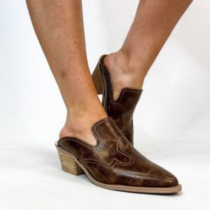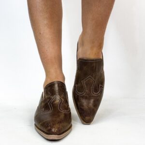 Bring on the western vibes with these rich brown distressed mules. With bold stitching and an easy slip-on fit, they’re the perfect blend of rugged and refined—ready for rodeo nights or coffee runs.