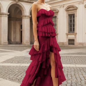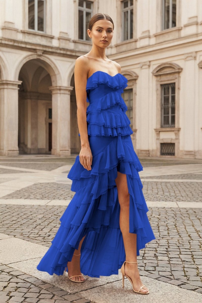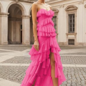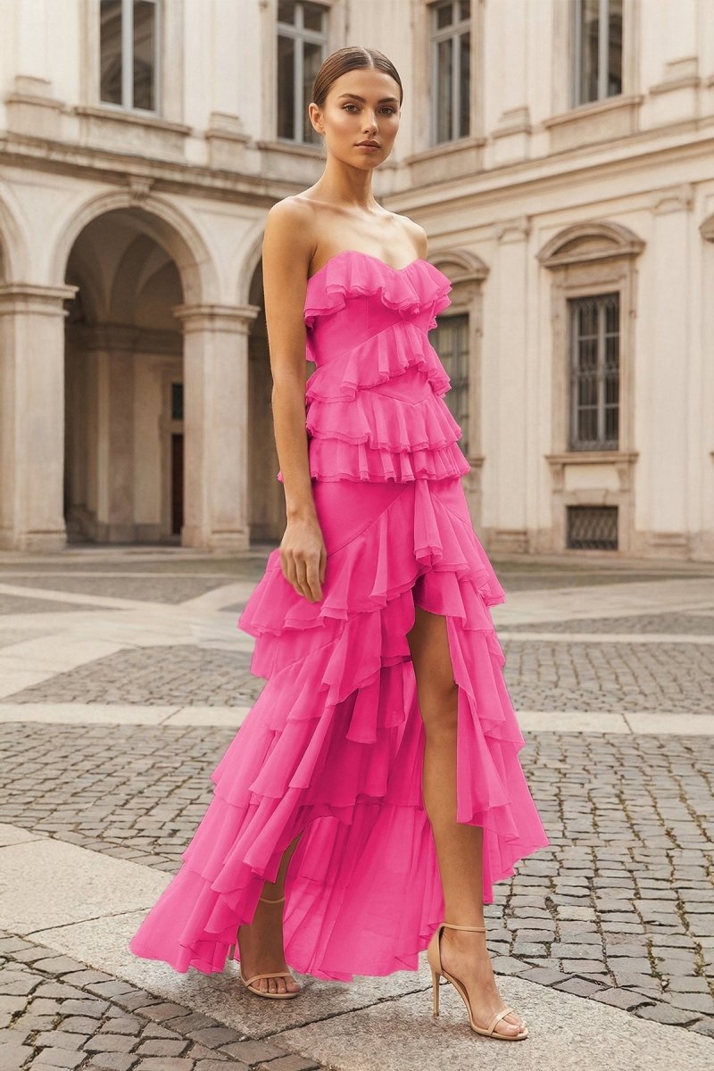 Elegant pink strapless sheath chiffon ruffled long prom dresses designed with premium fabric, perfect for special occasions and a confident, modern look.